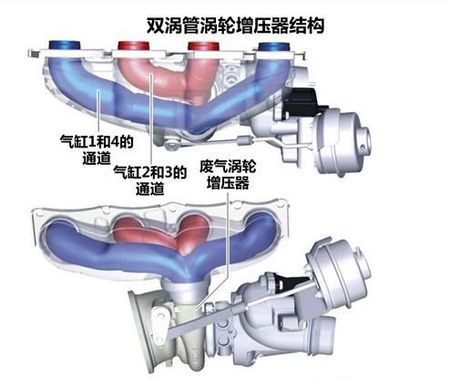 双涡轮虽然不错,但是两个涡轮把成本进一步提高,只能应用于高档车型上。于是,人们又从排气上想办法发展出双涡管。正常涡轮接到发动机的排气管上,但是发动机有多个气缸,冲程不同,有的气缸进气,有的气缸排气影响了排气的效率。而双涡管把气缸分组,没有进气气缸干扰,提高了排气的效率,也就提升了涡轮的效率。所以双涡管的涡轮介入可以早一点,涡轮迟滞可以轻一点。现在被宝马广泛应用,BMW记的汽油机用的都是双涡管技术。