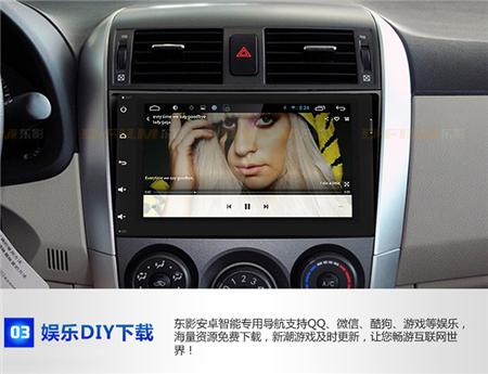 东影2012款丰田卡罗拉专用导航采用安卓4.4.2系统,四核高速处理器,一机多图,配置安全预警系统,独家电容屏,支持WIFI、手机、3G等多种上网方式,海量资源免费下载,支持1080P HD全格式视频播放
