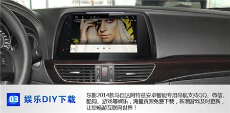 东影2014款马自达阿特兹专用导航采用安卓4.4.2系统,四核高速处理器,一机多图,配置安全预警系统,独家电容屏,支持WIFI、手机、3G等多种上网方式,海量资源免费下载,支持1080P HD全格式视频播放